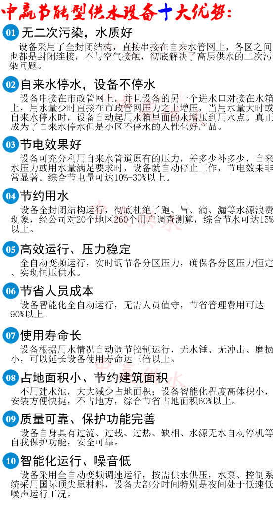 1、  設(shè)備直接串聯(lián)在自來水官網(wǎng)上,不用建水池,節(jié)約大量土地和資金。